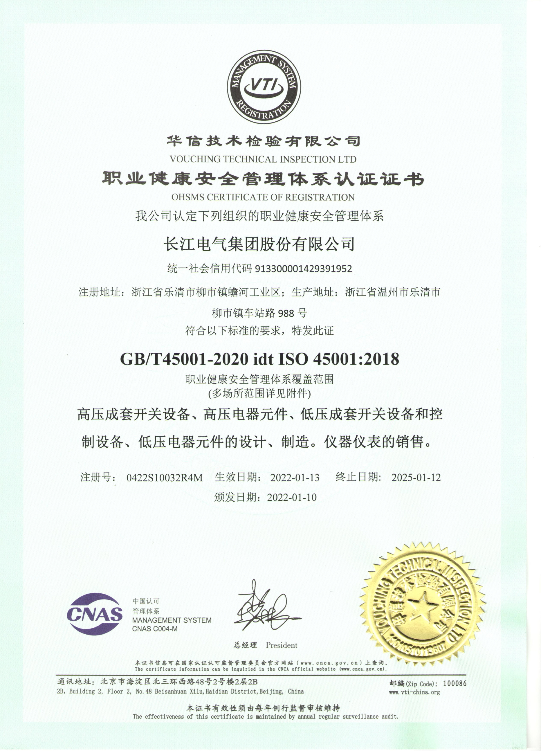 职业健康安全管理体系认证证书