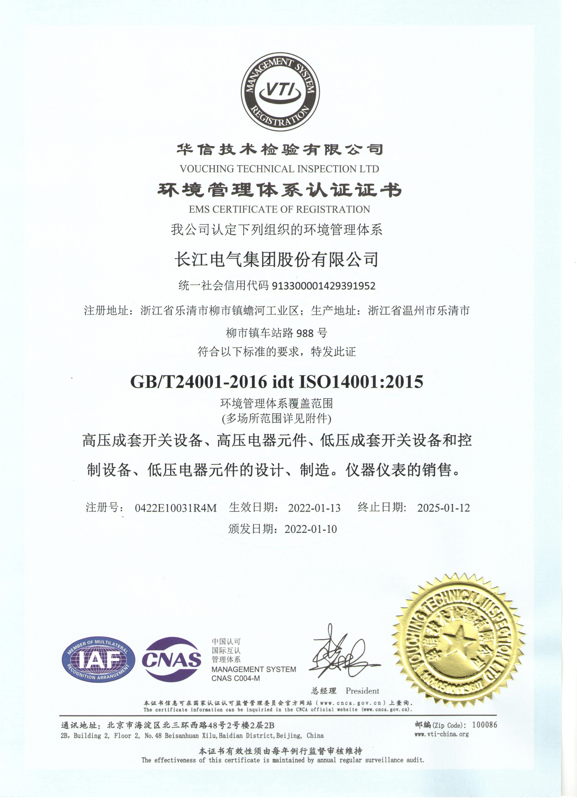 环境管理体系认证证书